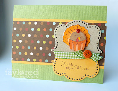 October is almost over and so it's time to start thinkin' about Turkey Day! This week's Card Positioning Systems sketch is being sponsored by Taylored Expressions, and so I thought I'd use it as an opportunity to break out my Gobble, Gobble set and get going on my Thanksgiving cards.